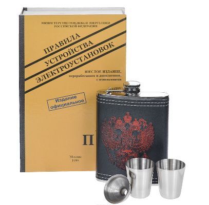 Подарочный набор "Правила устройства электроустановок" состоит из фляги, 2 стопок и воронки. Фляга изготовлена из нержавеющей стали и обтянута искусственной кожей черного цвета с тисненым рисунком герба России. В комплекте также имеются две металлические стопки и воронка для удобного заполнения фляги.