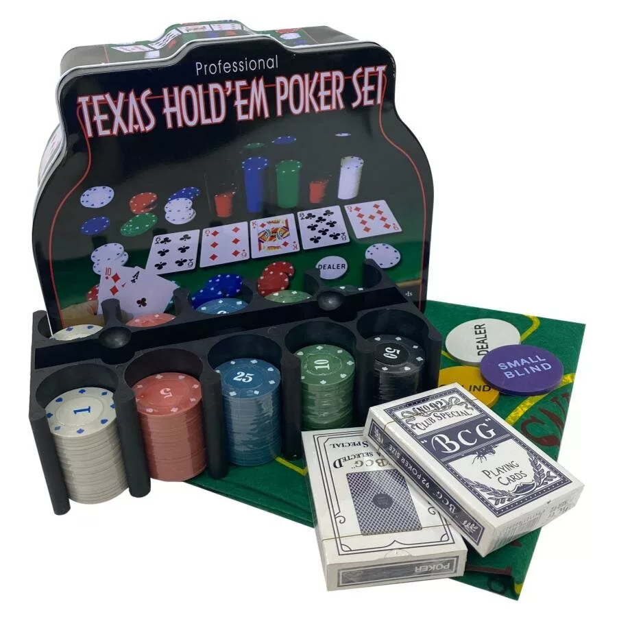 Набор для покера содержит:- металлическую жестяную ярко-красочную коробку