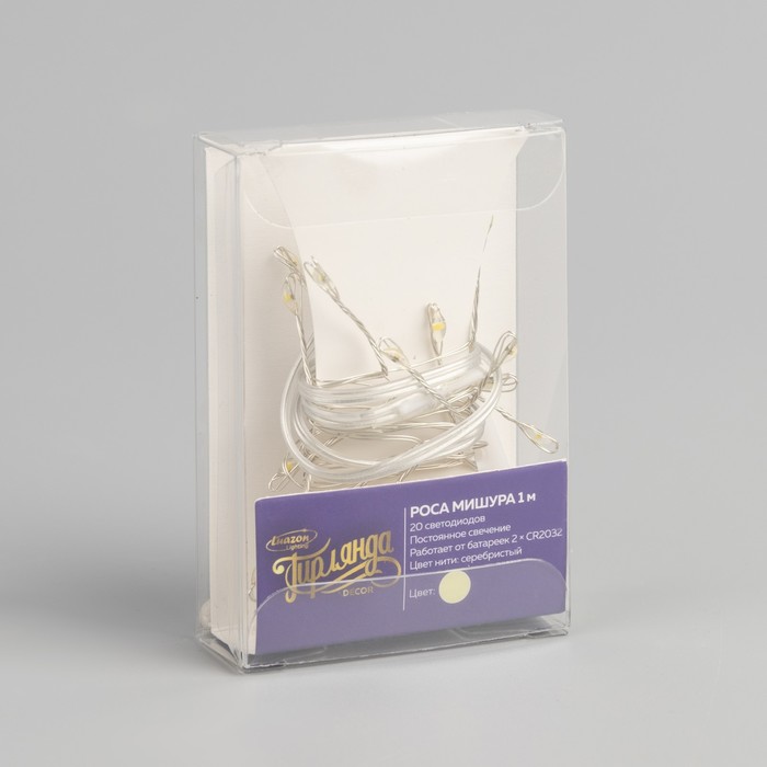 Гирлянда «Мишура» 1 м роса, IP20, серебристая нить, 20 LED, свечение тёплое белое, CR2032х2