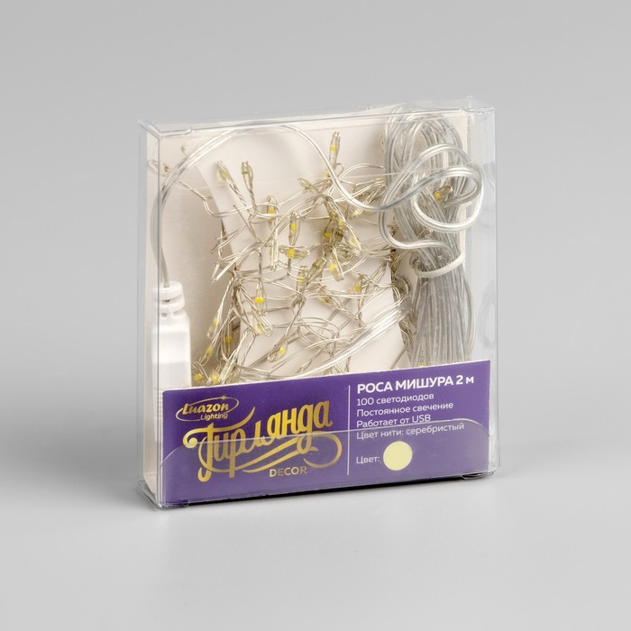 Гирлянда «Мишура» 2 м роса, IP20, серебристая нить, 100 LED, свечение тёплое белое, USB