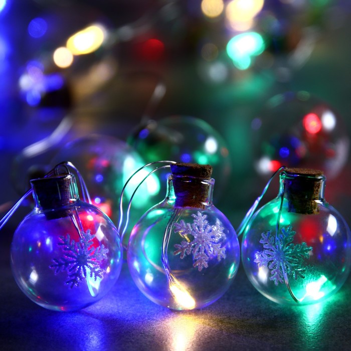 Гирлянда «Нить» 1.6 м с насадками «Шарики со снежинкой», IP20, прозрачная нить, 15 LED, свечение мульти, ААх2
