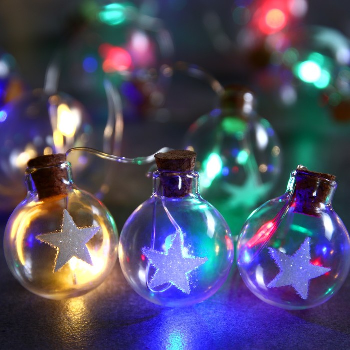 Гирлянда «Нить» 1.6 м с насадками «Шарики со звездой», IP20, прозрачная нить, 15 LED, свечение мульти, ААх2