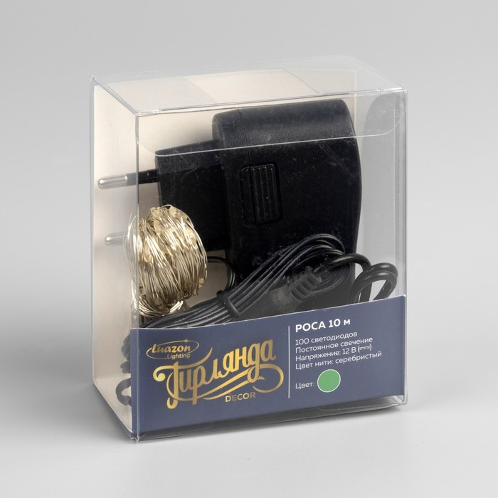 Гирлянда «Нить» 10 м роса, IP20, серебристая нить, 100 LED, свечение зелёное, 12 В