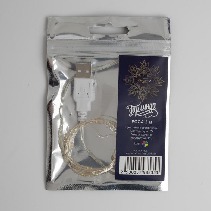 Гирлянда «Нить» 2 м роса, IP20, серебристая нить, 20 LED, свечение мульти, USB