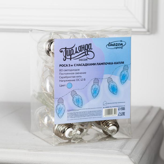 Гирлянда «Нить» 3 м с насадками «Лампочки капля», IP20, прозрачная нить, 80 LED, свечение синее, 8 режимов, 220 В