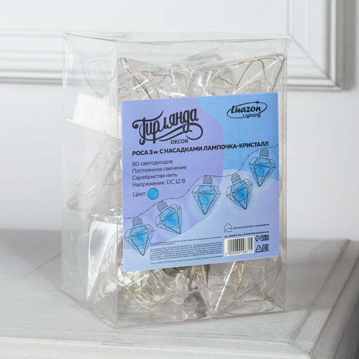 Гирлянда "Нить" 3 м с насадками "Лампочки кристалл", IP20, прозрачная нить, 80 LED, свечение синее, 8 режимов, 220 В