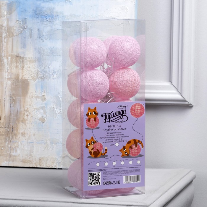 Гирлянда «Нить» 5 м с насадками «Клубки розовые», IP20, прозрачная нить, 20 LED, свечение белое, 220 В