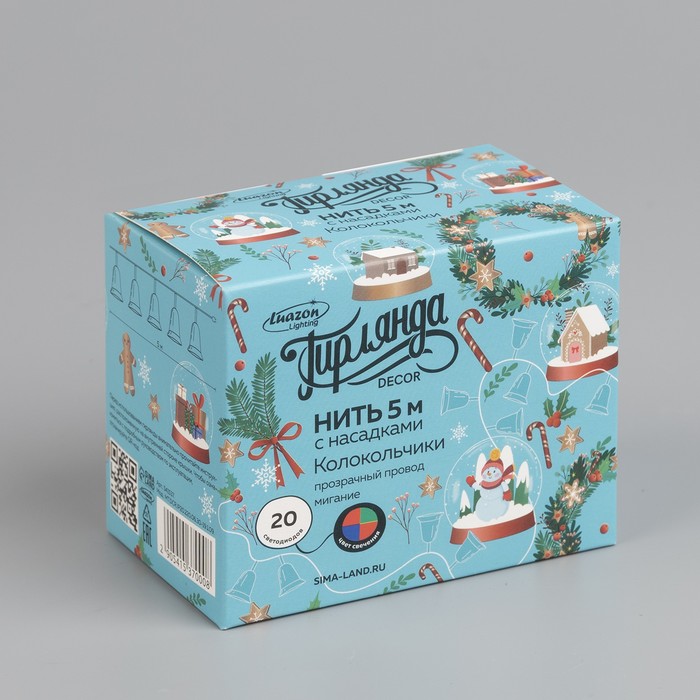 Гирлянда «Нить» 5 м с насадками «Колокольчики», IP20, прозрачная нить, 20 LED, свечение мульти (RG/RB), мигание, 220 В