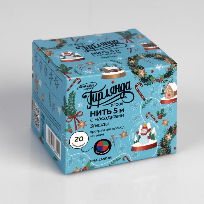 Гирлянда «Нить» 5 м с насадками «Звёзды», IP20, прозрачная нить, 20 LED, свечение мульти (RG/RB), мигание, 220 В