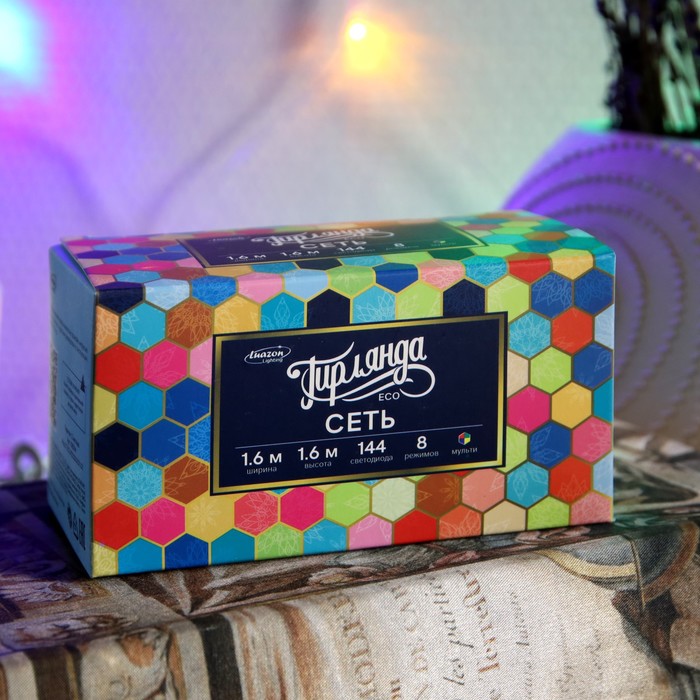 Гирлянда «Сеть» 1.6 × 1.6 м, IP20, прозрачная нить, 144 LED, свечение мульти, 8 режимов, 220 В