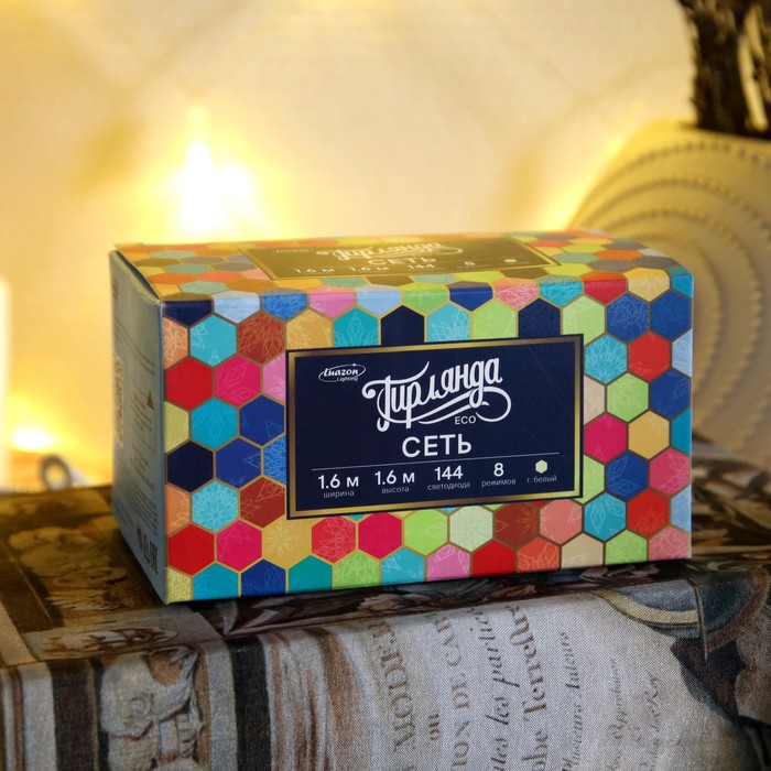 Гирлянда «Сеть» 1.6 × 1.6 м, IP20, прозрачная нить, 144 LED, свечение тёплое белое, 8 режимов, 220 В