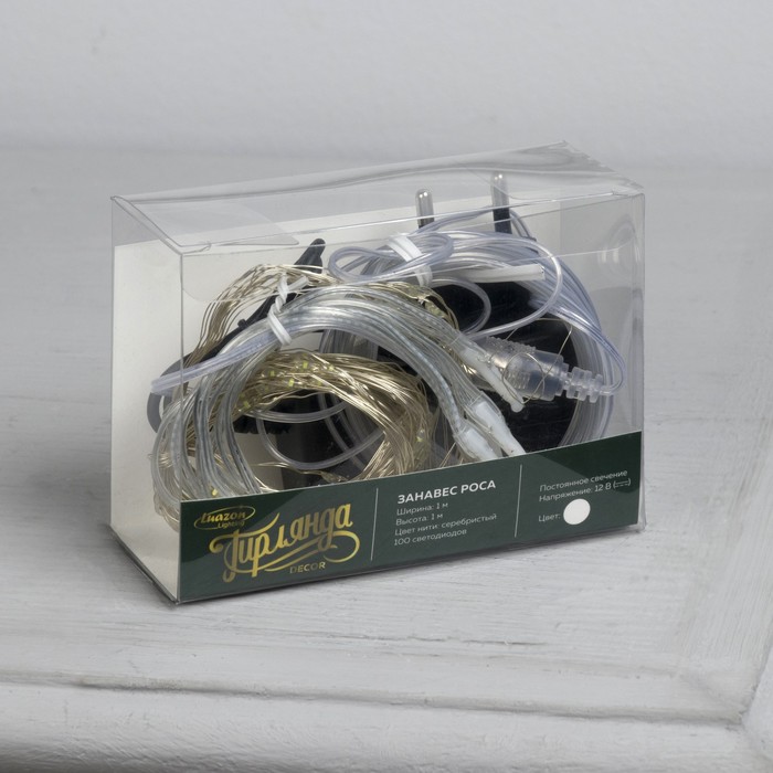 Гирлянда «Занавес» 1 × 1 м роса, IP20, серебристая нить, 100 LED, свечение белое, 12 В