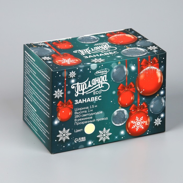 Гирлянда «Занавес» 1.5 × 1 м, IP20, прозрачная нить, 180 LED, свечение тёплое белое, 8 режимов, 220 В
