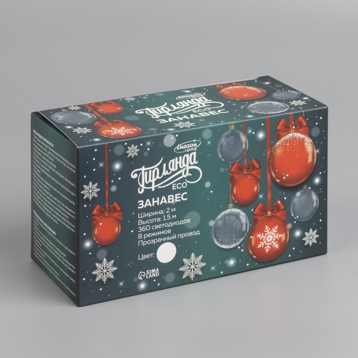 Гирлянда «Занавес» 2 × 1.5 м, IP20, прозрачная нить, 360 LED, свечение белое, 8 режимов, 220 В