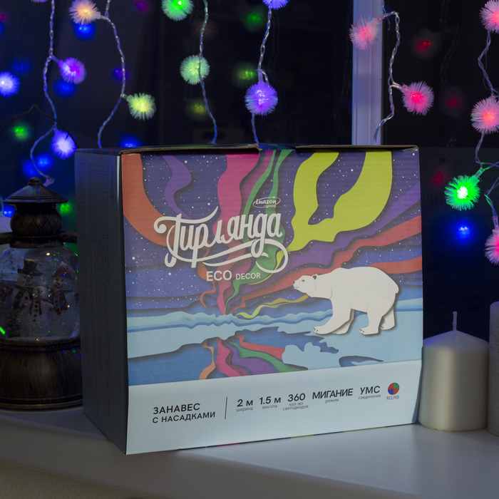Гирлянда «Занавес» 2 × 1.5 м с насадками «Ёжики», IP20, прозрачная нить, 360 LED, свечение мульти (RG/RB), мигание, 220 В