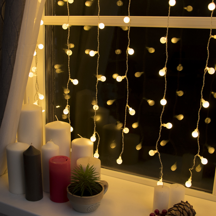 Гирлянда «Занавес» 2 х 1.5 м с насадками «Шарики», IP20, прозрачная нить, 360 LED, свечение тёплое белое, 8 режимов, 220 В