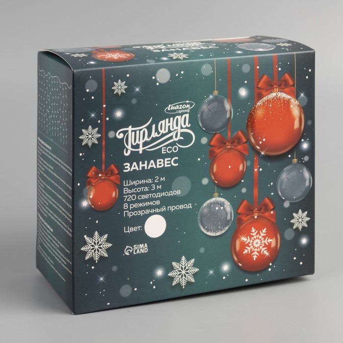 Гирлянда «Занавес» 2 х 3 м, IP20, прозрачная нить, 720 LED, свечение белое, 8 режимов, 220 В