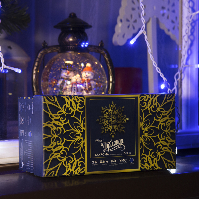 Гирлянда «Бахрома» 3 × 0.6 м, IP44, УМС, белая нить, 160 LED, свечение синее, мерцание белым, 220 В