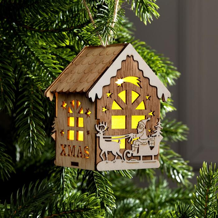 Ёлочная игрушка «Домик с Дедом Морозом на санках», от батареек, свечение тёплое белое