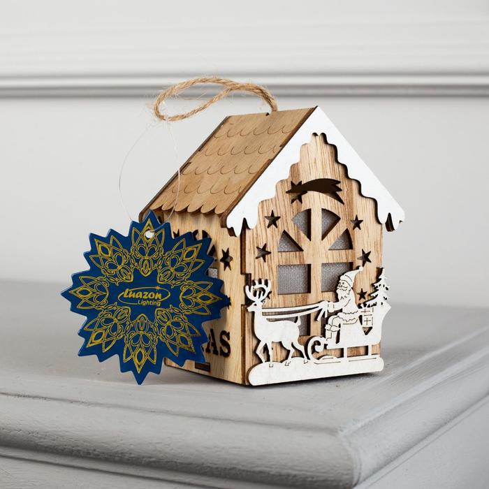Ёлочная игрушка «Домик с Дедом Морозом на санках», от батареек, свечение тёплое белое