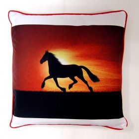 На одной стороне подушки-чехла нанесено изображение с лошадью, другая сторона - красная (под цвет пледа).