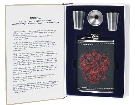 Подарочный набор "Памятка страховому агенту" состоит из фляги, 2 стопок и воронки. Фляга изготовлена из нержавеющей стали и обтянута искусственной кожей черного цвета с тисненым рисунком герба России. В комплекте также имеются две металлические стопки и воронка для удобного заполнения фляги.