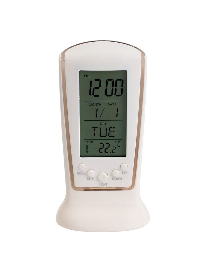 Электронные часы‑будильник в белом корпусе — компактное и многофункциональное решение для спальни или рабочего уголка. Прибор отображает время, дату и температуру на крупном экране, легко читаемом с расстояния. Устройство имеет встроенную подсветку синего цвета.