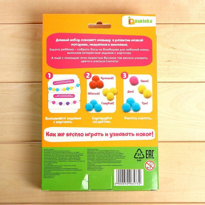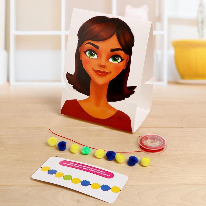 - Попросите малыша собрать бусы из бомбошек, выполняя задания с карточек.