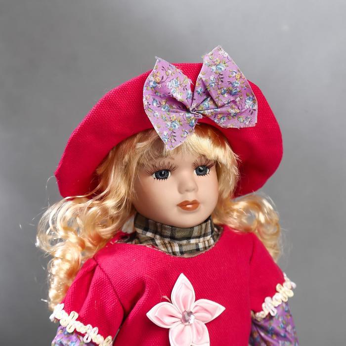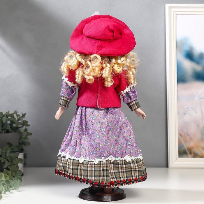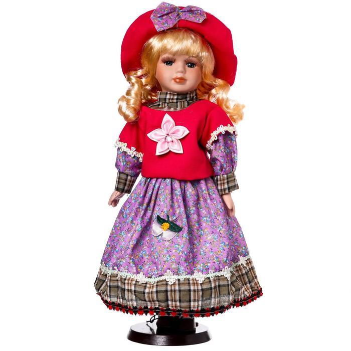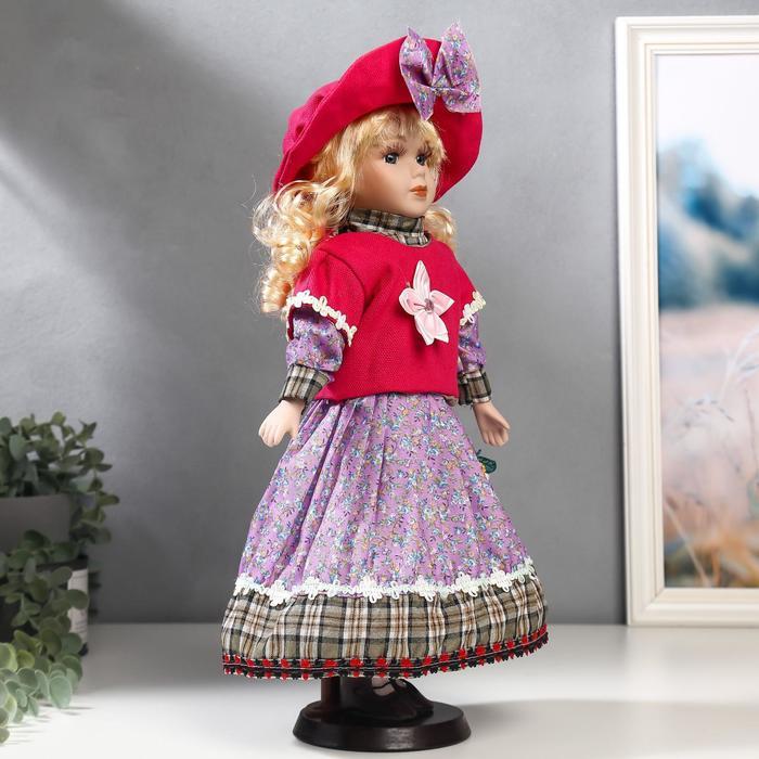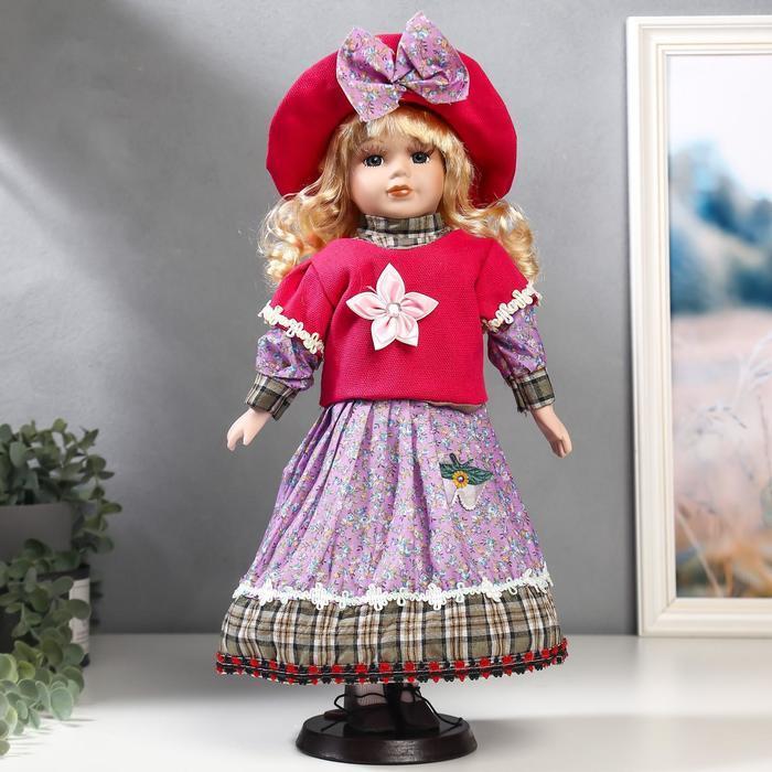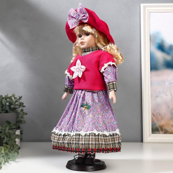 Кукла коллекционная керамика "Блондинка с кудрями, розовая свитер, юбка сирень" 40 см