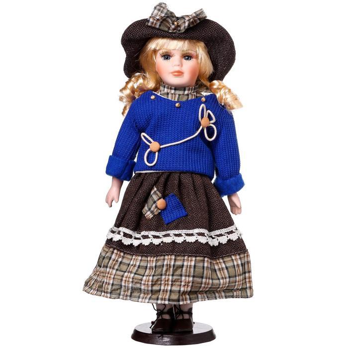 Кукла коллекционная керамика "Блондинка с кудрями, синий свитер с цветком" 40 см