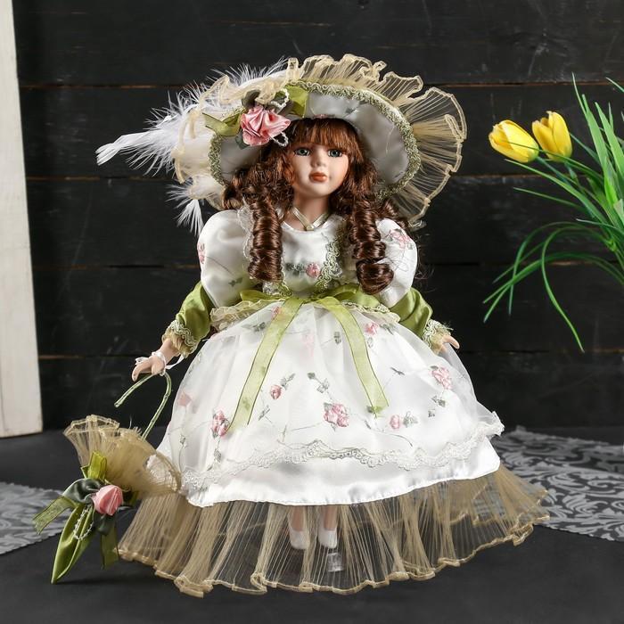 Кукла коллекционная керамика "Лидия в оливковом платье с цветами с зонтом" 30 см