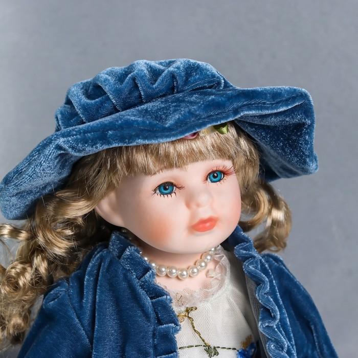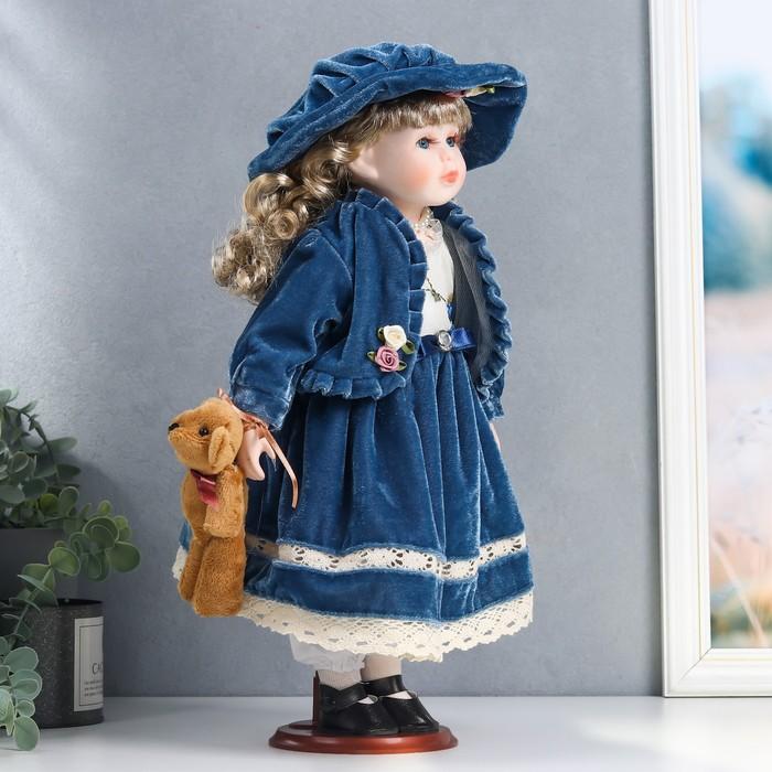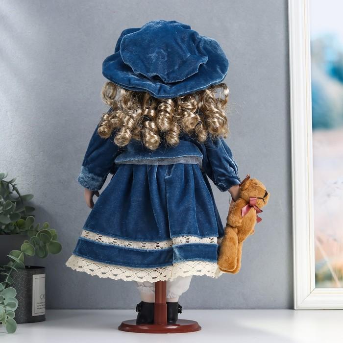 Кукла коллекционная керамика "Настенька в синем бархатном платье, с мишкой" 40 см