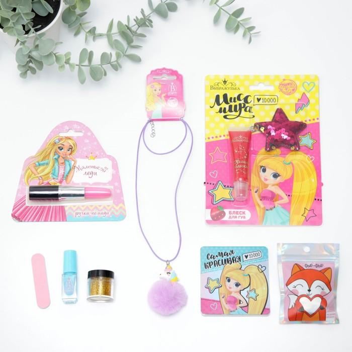 Порадуйте свою модницу набором детской косметики и аксессуаров!Превратим каждый день в праздник с помощью яркого макияжа и сверкающих ноготков, волшебной ручкой запишем самые заветные желания, завершим образ пушистой подвеской!