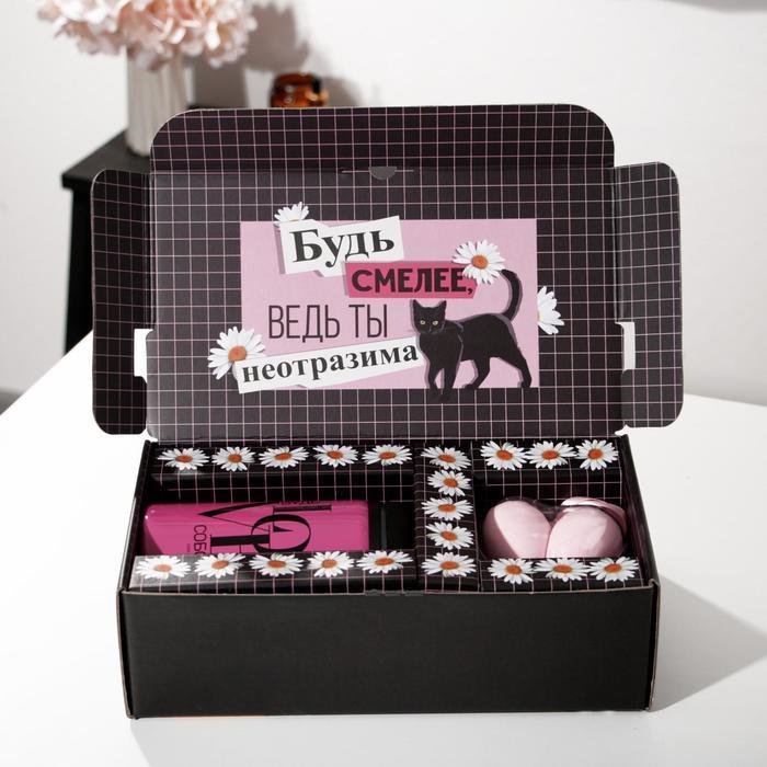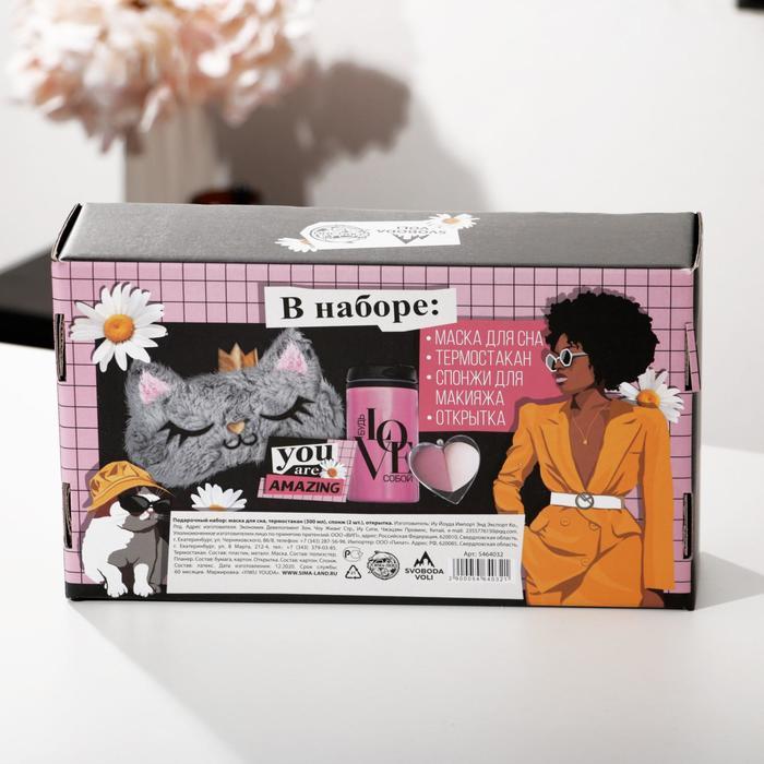 Подарочный набор "Не бойся быть ярче", маска для сна, термостакан, спонж 2шт, открытка