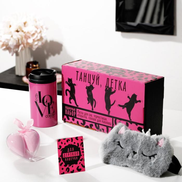 Подарочный набор "Танцуй", маска для сна, термостакан, спонж 2шт, открытка