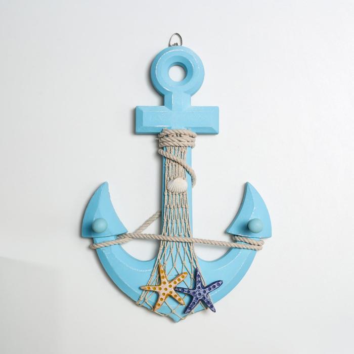 Крючки декоративные дерево "Якорь с сетью и морскими звёздами" голубой 32,5х22,5х5 см