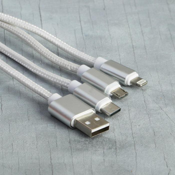 Кабель имеет 3 выхода для разных разъёмов телефона: на IPhone (разъём Apple) и Android (разъёмы microUSB и Type-C).