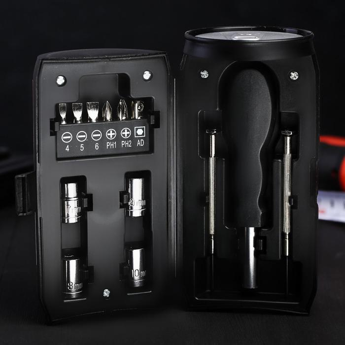 Подарочный набор в банке состоит из 13 предметов, каждый из которых будет полезен и надежен в тысячах жизненных ситуациях: при ремонте автомобиля или бытовой техники, при сантехнических работах в квартире или на даче и так далее. Для удобства работы данными приспособлениями предусмотрена удобная в обхвате рукоятка, повторяющая форму ладони.Оригинальный дизайн кейса послужит еще одним приятным дополнением для любого мужчины