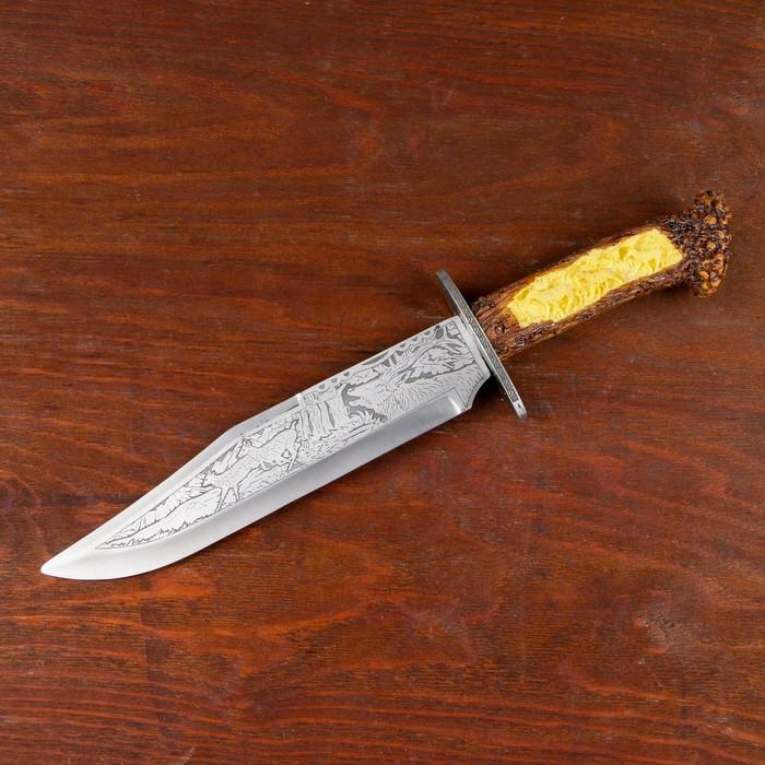 Страсть к оружию у мужчин в крови. Даже если он не заядлый охотник, турист или рыбак, ему приятно будет держать в руке такой замечательный сувенирное изделие, на подставке с лосем, на лосинных рогах 38х20 см.
