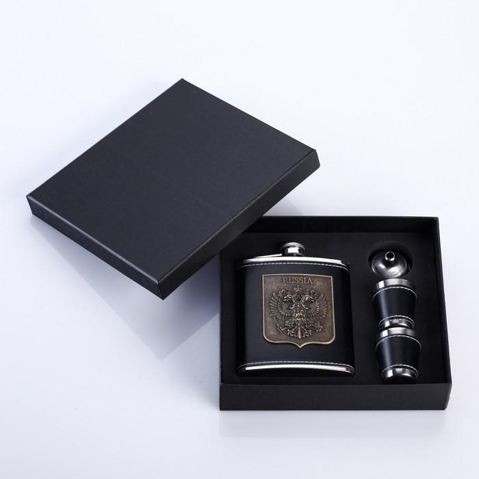 Подарочный набор "Герб России" 4 в 1: фляжка 210 мл, воронка, 2 рюмки, чёрный, 17х20 см
