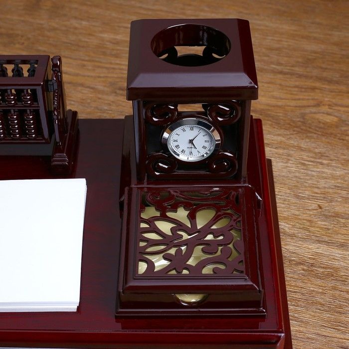 Компактный настольный набор поможет избежать хаоса на рабочем месте. Храните в нём канцелярские принадлежности или другие мелочи, чтобы правильно организовать пространство. К тому же изделие имеет минималистичный дизайн и выполнено под дерево, поэтому оно украсит собой любое место как декоративный элемент.