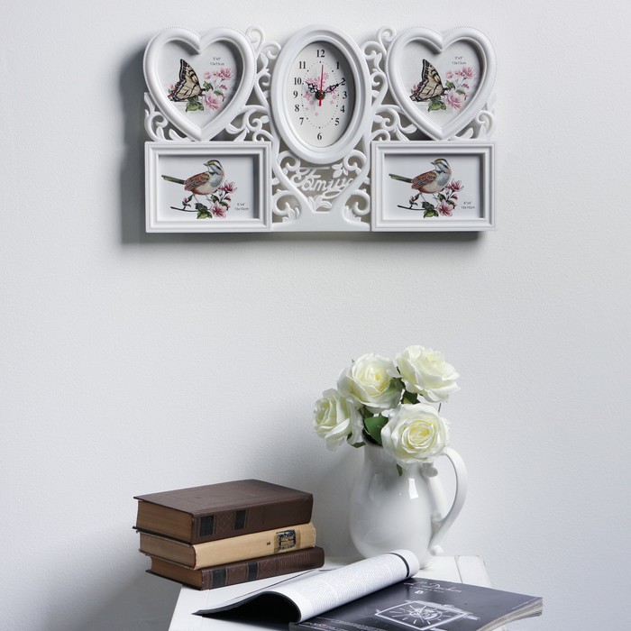 Часы настенные, серия: Фото, "Family", сердечки белые, 4 фоторамки, 50х30 см, микс