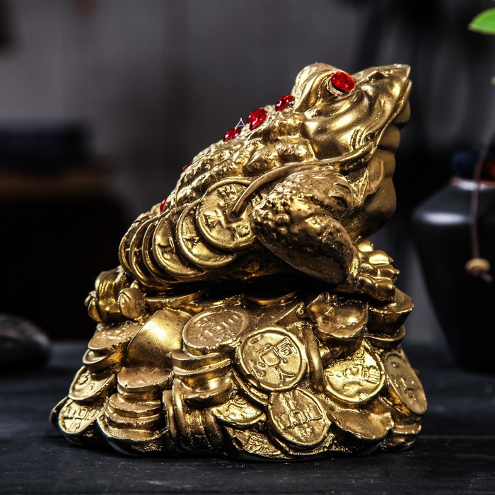 Трёхлапая жаба с монеткой во рту является очень сильным денежным талисманом, который приносит богатство, финансовую удачу и процветание. Иногда это животное используют как символ долголетия, потому что некоторые их виды живут до 40 лет.Согласно фэн-шуй копилки с деньгами целесообразно хранить в западной или северо-западной частях помещения.