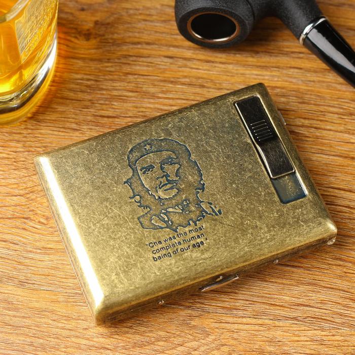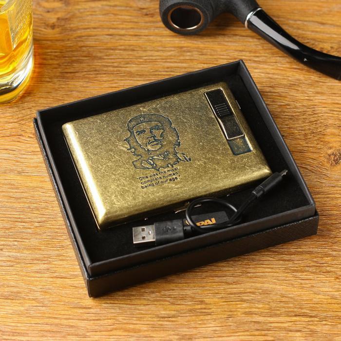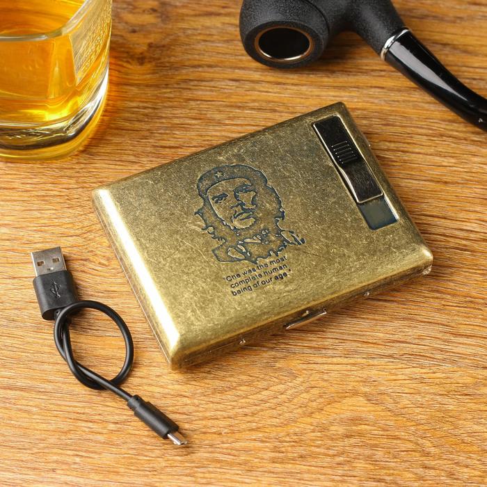 Портсигар с электронной зажигалкой "Чегевара", от USB, золотой, 14х13.5 см