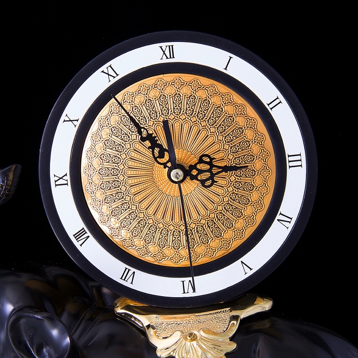 Полный состав: основа из итальянского мрамора, слон из полимера, детали (ногти, бивни, пояс) из сплава цинка с золотым покрытием, часы из дерева с лаковым покрытием, механизм кварцевый.