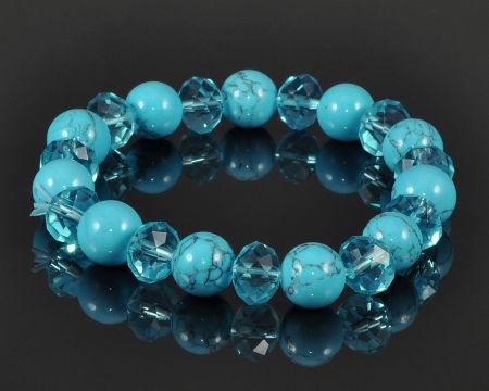 Браслет из прессованной бирюзы, хрусталя на резинке. Диаметр бусин 10 мм, минимальный размер изделия 17 см.