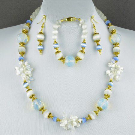 Бусы из кахолонга, лунного камня. Длина бус 56 см, браслета-15 см, сережек-4 см.