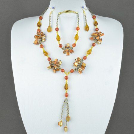 Авторские бусы из сердолика, перламутра, хрусталя. Длина бус 50 см. Длина браслета-20 см, сережек-4 см.