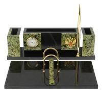 Письменный набор из камня "Люкс" с гербом РФ, часами и ручкой №44 (камень змеевик), 30 х 23 х 9 см